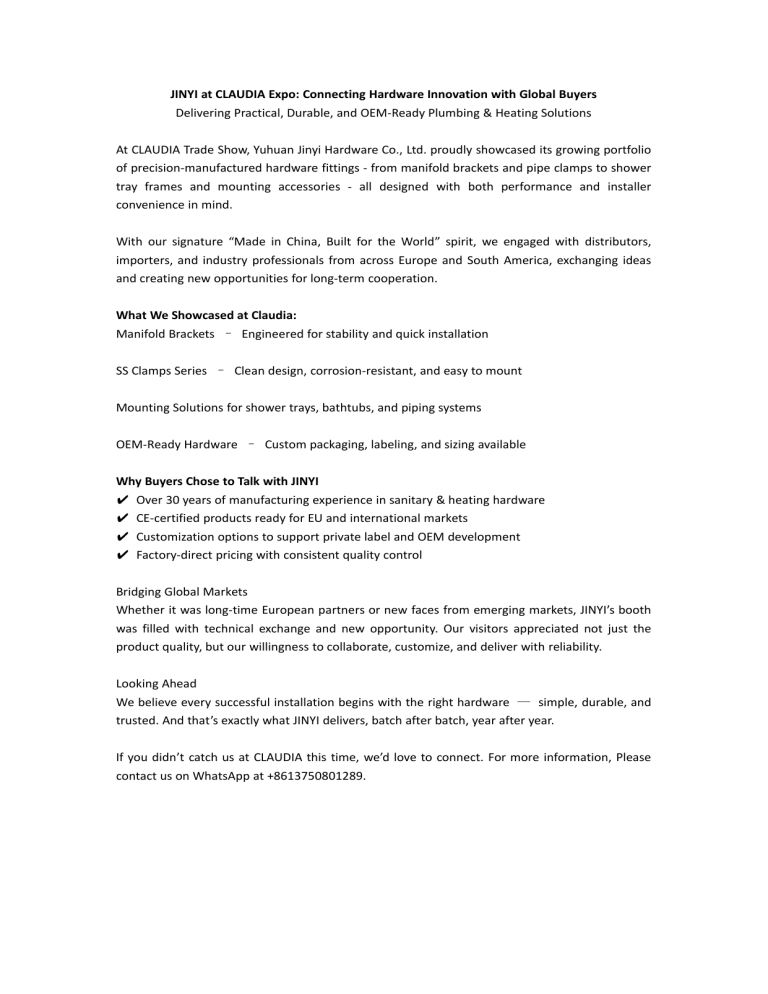 JINYI at CLAUDIA Expo: Connecting Hardware Innovation with Global Buyers Delivering Practical, Durable, and OEM-Ready Plumbing & Heating Solutions At CLAUDIA Trade Show, Yuhuan Jinyi Hardware Co., Ltd. proudly showcased its growing portfolio of precision-manufactured hardware fittings - from manifold brackets and pipe clamps to shower tray frames and mounting accessories - all designed with both performance and installer convenience in mind. With our signature “Made in China, Built for the World” spirit, we engaged with distributors, importers, and industry professionals from across Europe and South America, exchanging ideas and creating new opportunities for long-term cooperation. What We Showcased at Claudia: Manifold Brackets – Engineered for stability and quick installation SS Clamps Series – Clean design, corrosion-resistant, and easy to mount Mounting Solutions for shower trays, bathtubs, and piping systems OEM-Ready Hardware – Custom packaging, labeling, and sizing available Why Buyers Chose to Talk with JINYI ✔ Over 30 years of manufacturing experience in sanitary & heating hardware ✔ CE-certified products ready for EU and international markets ✔ Customization options to support private label and OEM development ✔ Factory-direct pricing with consistent quality control Bridging Global Markets Whether it was long-time European partners or new faces from emerging markets, JINYI’s booth was filled with technical exchange and new opportunity. Our visitors appreciated not just the product quality, but our willingness to collaborate, customize, and deliver with reliability. Looking Ahead We believe every successful installation begins with the right hardware — simple, durable, and trusted. And that’s exactly what JINYI delivers, batch after batch, year after year. If you didn’t catch us at CLAUDIA this time, we’d love to connect. For more information, Please contact us on WhatsApp at +8613750801289.