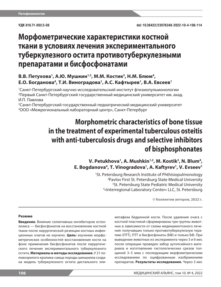 Патофизиология УДК 616.71-002.5-08 doi: 10.36422/23076348-2022-10-4-106-114 Морфометрические характеристики костной ткани в условиях лечения экспериментального туберкулезного остита противотуберкулезными препаратами и бисфосфонатами В.В. Петухова1, А.Ю. Мушкин1,2, М.М. Костик3, Н.М. Блюм4, Е.О. Богданова4, Т.И. Виноградова1, А.С. Кафтырев1, В.А. Евсеев1 1 Санкт-Петербургский научно-исследовательский институт фтизиопульмонологии Первый Санкт-Петербургский государственный медицинский университет им. акад. И.П. Павлова 3 Санкт-Петербургский государственный педиатрический медицинский университет 4 ООО «Межрегиональный лабораторный центр», Санкт-Петербург 2 Morphometric characteristics of bone tissue in the treatment of experimental tuberculous osteitis with anti-tuberculosis drugs and selective inhibitors of bisphosphonates V. Petukhova1, A. Mushkin1,2, M. Kostik3, N. Blum4, E. Bogdanova4, T. Vinogradova1, A. Kaftyrev1, V. Evseev1 1 St. Petersburg Research Institute of Phthisiopulmonology 2 Pavlov First St. Petersburg State Medical University 3 St. Petersburg State Pediatric Medical University 4 «Interregional Laboratory Center» LLC, St. Petersburg © Коллектив авторов, 2022 г. Резюме Введение. Влияние селективных ингибиторов остеолизиса — бисфосфонатов на восстановление костной ткани после хирургической резекции костных инфекционных очагов не изучено. Цель: изучение морфометрических особенностей восстановления кости на фоне применения бисфосфонатов после хирургического лечения экспериментального туберкулезного остита. Материалы и методы исследования. У 21 половозрелого кролика-самца породы шиншилла создана модель туберкулезного остита дистального эпи- 106 метафиза бедренной кости. После удаления очага с костной пластикой сформированы три группы животных в зависимости от схемы медикаментозного лечения: получавших только противотуберкулезную терапию (ПТТ), ПТТ и бисфосфонаты (БФ) и только БФ. При выведении животных из эксперимента через 3 и 6 мес после операции проведен забор аутопсийного материала и изготовление гистологических срезов толщиной 3–5 мкм с последующим морфометрическим исследованием по оцифрованным изображениям препаратов. Результаты исследования. Через 3 мес МЕДИЦИНСКИЙ АЛЬЯНС, том 10, № 4, 2022 Патофизиология после операции отмечена статистически достоверно большая толщина костных балок в группе кроликов, получавших терапию ПТТ + БФ, через 6 мес — получавших только БФ (p<0,001). Во всех исследуемых группах через 6 мес после операции достигнуто купирование специфического туберкулезного воспаления более чем в 50% наблюдений. Выводы. Применение БФ в лечении экспериментального туберкулезного остита не влияет на частоту обнаружения и площадь специфического воспаления, при этом обеспечивает наибольшие значения толщины костных балок на сроках 3 и 6 мес после оперативного лечения. Ключевые слова: туберкулез, бисфосфонаты, остит, остеомиелит, костная плотность Summary Introduction. The effect of bisphosphonates on bone recovery after surgical treatment of osteitis has not been fully understood. Aim: To study morphometric features of bone restoration when bisphosphonates are used after the surgical treatment of experimental tuberculous osteitis. Material and methods. Experimental model of TB Введение Особенностью поражения костей при туберкулезе является формирование обширных зон деструкции, причем наличие ограниченных форм заболевания (оститов) характерно для пациентов детского возраста [1, 2]. Современное комплексное лечение костно-суставного туберкулеза заключается в хирургической резекции патологических очагов и проведении длительной противотуберкулезной терапии (ПТТ), подобранной согласно чувствител